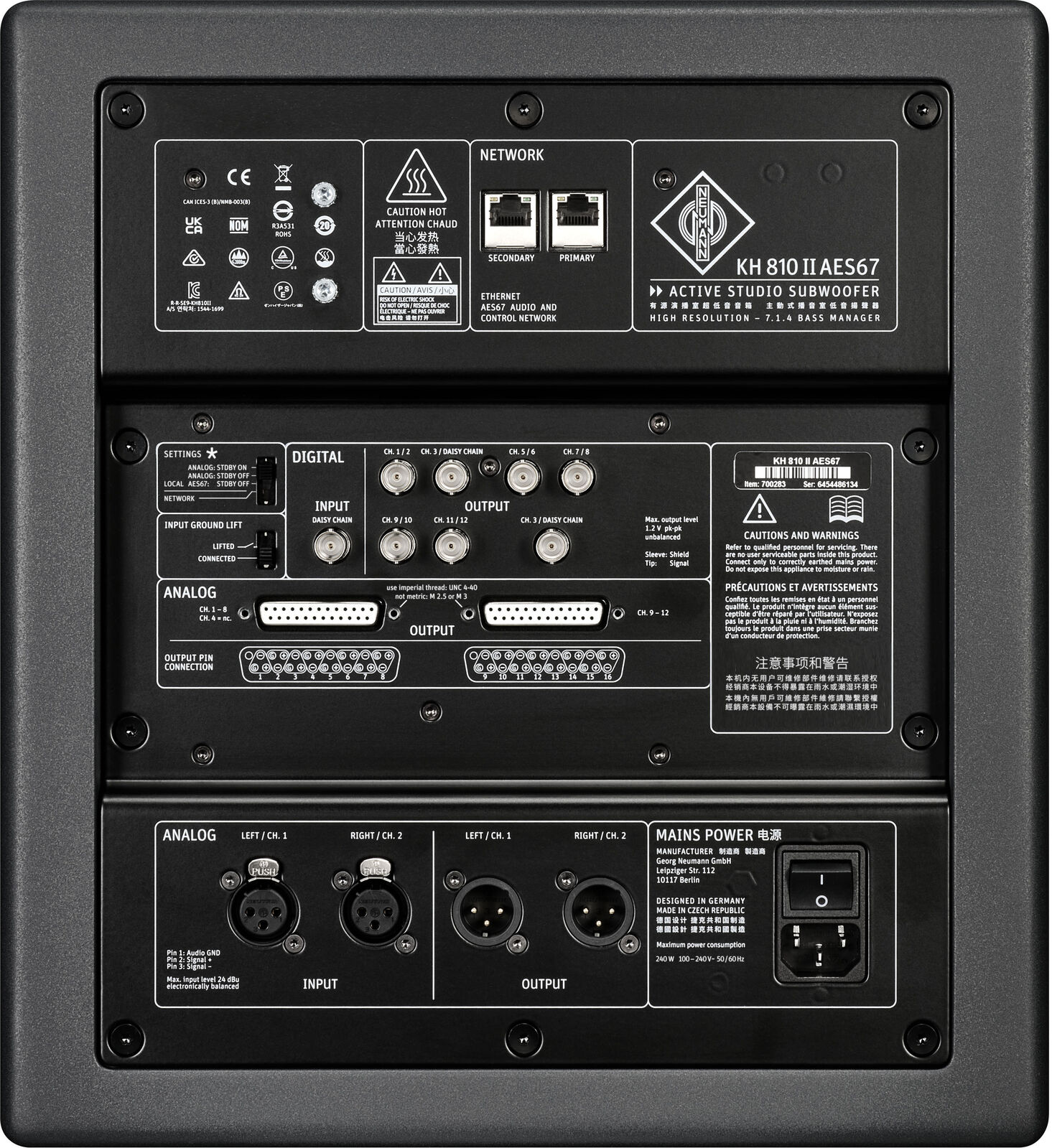 Two analog XLR inputs and outputs are available to connect the subwoofer for stereo operation. For multichannel operation, the KH 810 II AES67 offers two Sub D25 connectors for analog connection as well as seven AES3 outputs (BNC) for digital connection to 11 studio monitors. All analog inputs and outputs are electronically balanced. The AES3 outputs (BNC) are compatible to S/P-DIF inputs on Neumann studio monitors using a BNC to RCA cable.