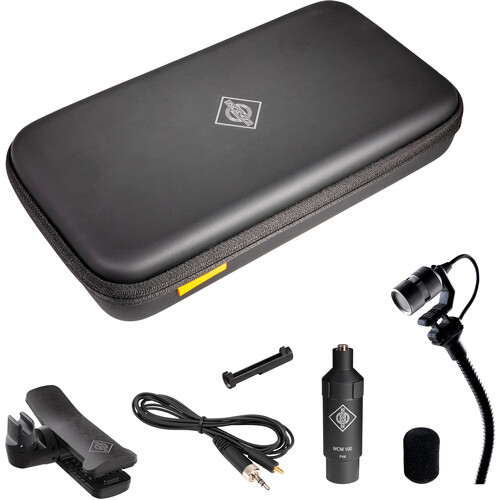 Complete set for using the Miniature Clip Mic system on the bell of a trumpet, trombone, saxophone or other horn, on percussion instruments and on pole stands. Contains: KK 14 capsule, SH 150 gooseneck, KC 1 cable brace, AC 31 cable, MCM 100 output stage, WS 110 wind shield, MC 6 clip. Delivered in a handy soft case.