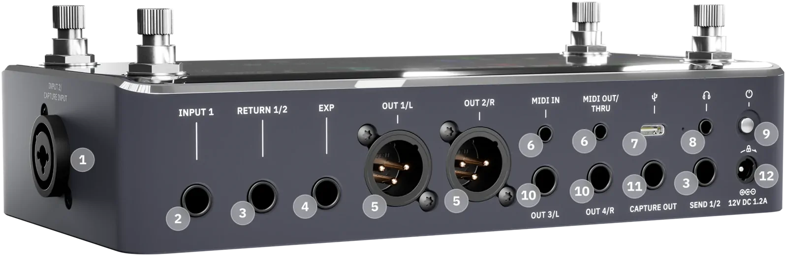 Expression Input: 1/4" TRS input for connecting an expression pedal to control parameters like volume, wah, pitch, or effects in real time. A second expression input is available via MIDI.