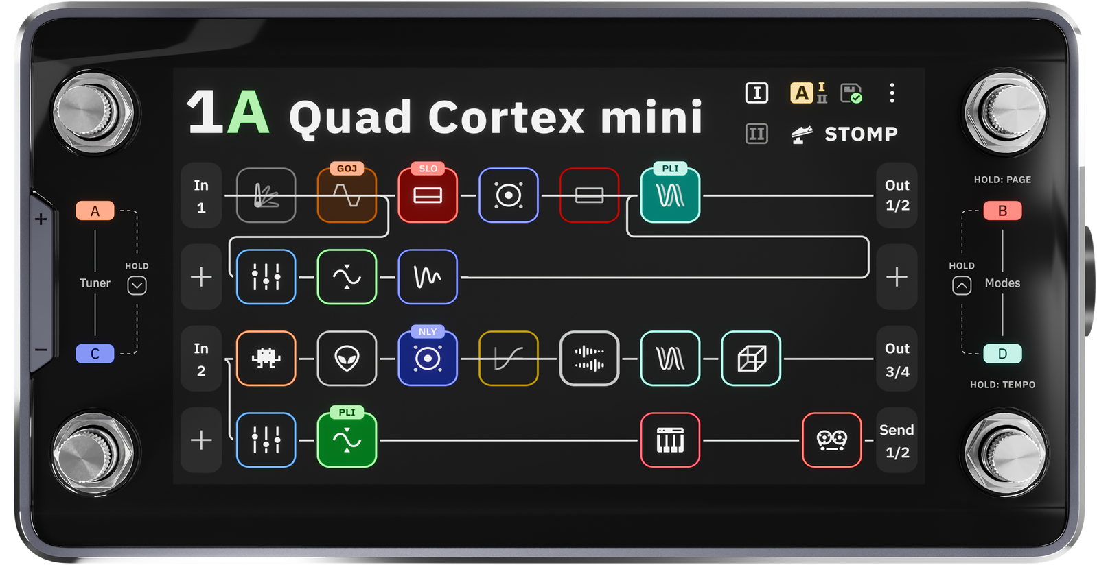 The Grid is the visual workspace at the heart of Quad Cortex mini. It makes building, understanding, and modifying signal chains intuitive, with no menu diving or hidden layers