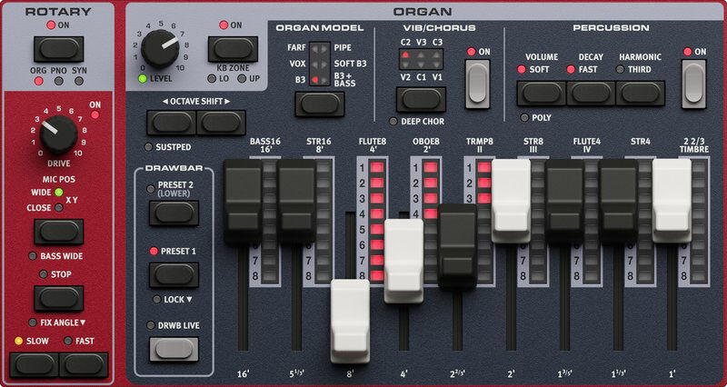 The Organ Section is based on the Nord Organ 3 engine and features stunning recreations of classic tonewheel, transistor, and pipe organs as well as the latest generation of our acclaimed Rotary Speaker emulation with multiple microphone perspectives.