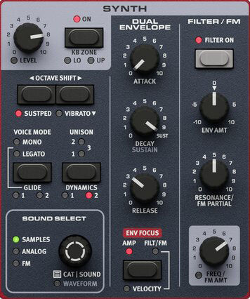 A brand new Synth Section introducing Analog Waveforms and FM synthesis alongside high-quality Samples from the Nord Sample Library. The Synth Section includes Mono, Legato and Glide modes for expressive performance control. Low-Pass Filter with resonance and dual ADR envelopes for Amp and Filter/FM Amount designed for exceptional real time control.