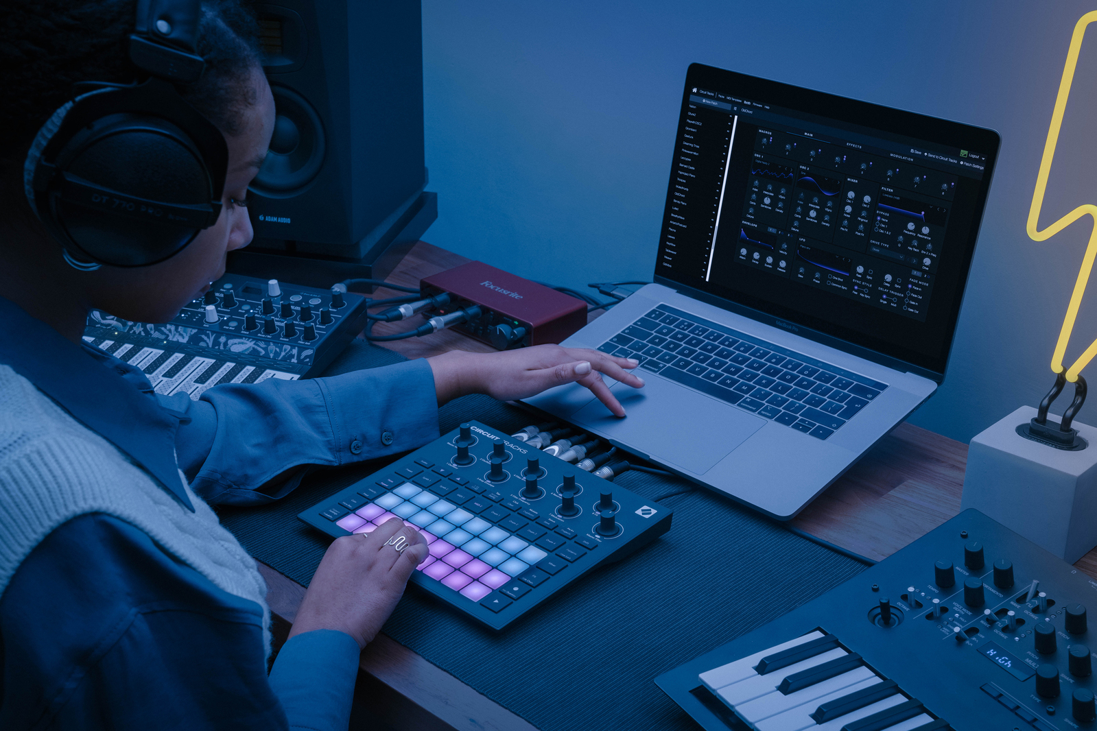 A powerful and versatile sampler for making and performing beats. Record samples directly in, then slice, sculpt and resample them effortlessly. Grooves can be quantised or captured off-grid, and layers can be built up across eight sample tracks. Live sets come alive with performance FX. Circuit Rhythm can be integrated into any MIDI-enabled studio rig, or unplugged for creators on the move.