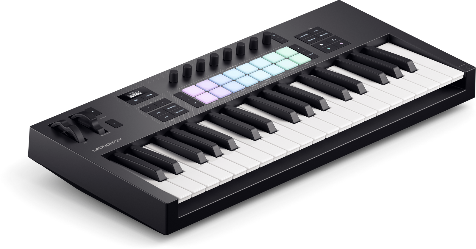 Add inspiration to your setup with Launchkey 37 – a compact, all-in-one DAW controller with three octaves of full-size, synth-action keys, and 16 patented FSR pads for finger drumming, clip launching, and more. The next generation of Launchkey also gives you new ways to get creative in your DAW, with hardware synths, or on iPhone and iPad. Chord, Scale, and Arpeggio Modes have each been expanded to help you stay in key and perform in even more expressive ways – all with detailed feedback from the crisp, new OLED display.