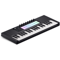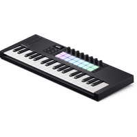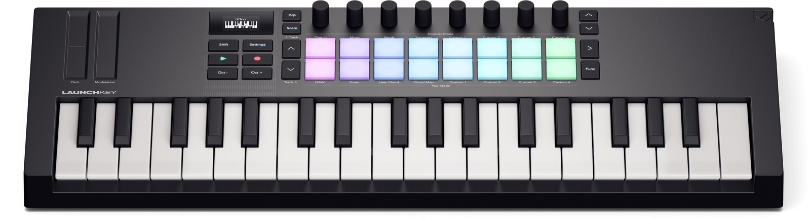 Find inspiration anywhere with Launchkey Mini 37 – a portable, all-in-one DAW controller with three octaves of synth-action minikeys and 16 patented FSR pads for finger drumming, clip launching, and more. The next generation of Launchkey also gives you new ways to get creative in your DAW, with hardware synths, or on iPhone and iPad. Chord, Scale, and Arpeggio Modes have each been expanded to help you stay in key and perform in even more expressive ways – all with detailed feedback from the crisp, new OLED display.