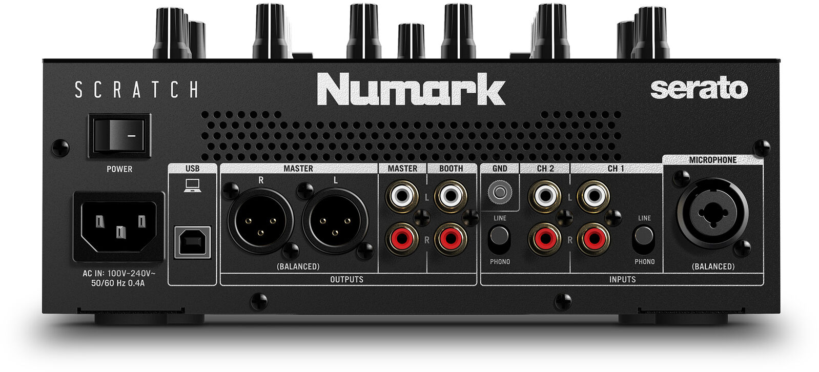 Scratch has all the necessities with premium features for any setup. There is an XLR main output and unbalanced booth output for the best booth/dance floor experience. There are unbalanced inputs for both line and phono inputs for each channel. A microphone/auxiliary input for XLR or ¼-inch TS controlled by the mic level knob on the mixer gives you all the versatility you could ask for.