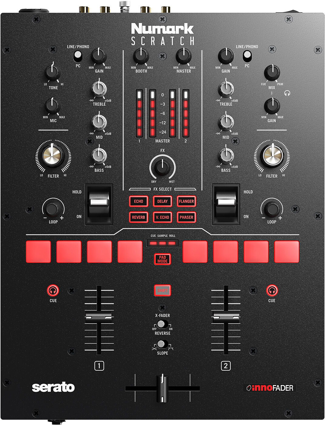 Scratch is really something special—It brings a new look and design to the mixer category. It boasts an all-metal build with professional features such as a built-in Innofader crossfader, performance pads, instant loop encoder, and toggle paddles to trigger software-based effects. To top it off, it comes with Serato DJ Pro and Scratch is Serato DVS ready.