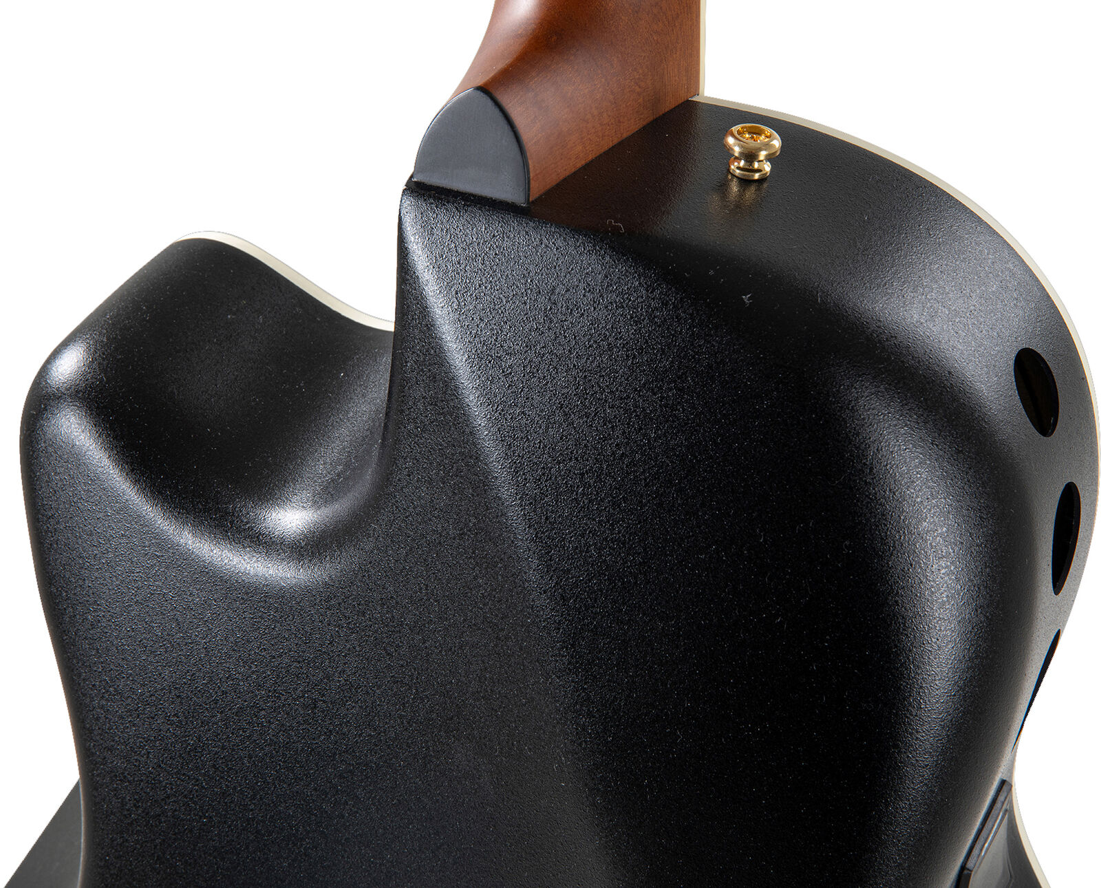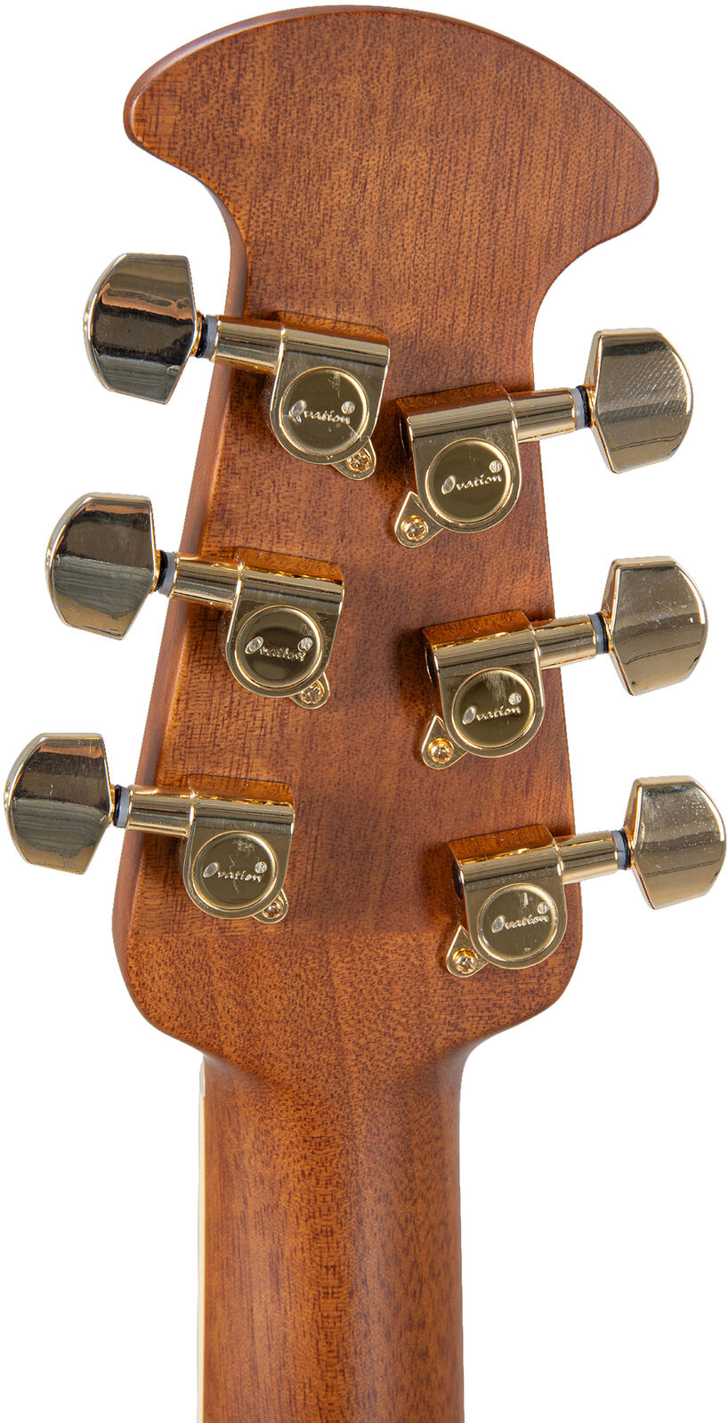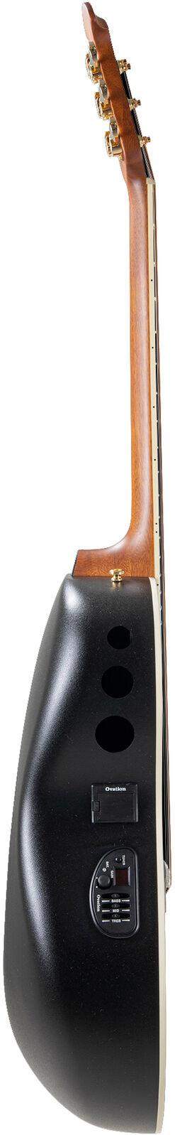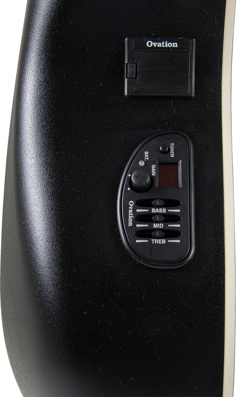 The electro-acoustic signal processing starts with an Ovation Slimline pickup at the bridge of the guitar, which (as the name already says) stands out due to its slim design. The pressure point on the piezo crystals is increased by the serrated bridge inlay, which favours a particularly even sound. Before the signal leaves the guitar, it is refined by an Ovation OP4BT preamp with 3-band EQ and built-in tuner.