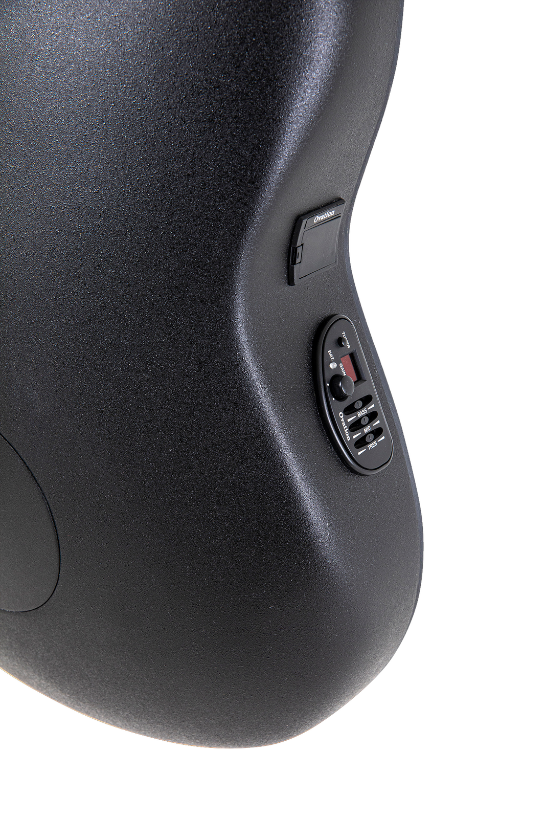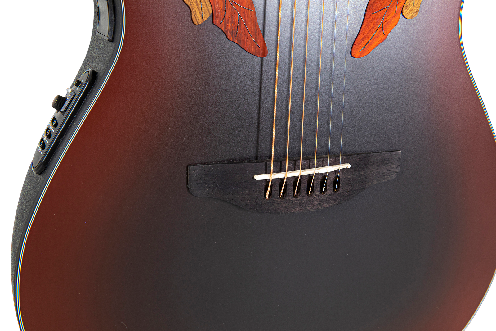 The electro-acoustic signal processing starts with an Ovation Slimline pickup at the bridge of the guitar, which - as the name already says - stands out due to its slim design. The pressure point on the piezo crystals is increased by the serrated bridge inlay, which favours a particularly even sound. Before the signal leaves the guitar, it is refined by an Ovation OP4BT preamp with 3-band EQ and built-in tuner.