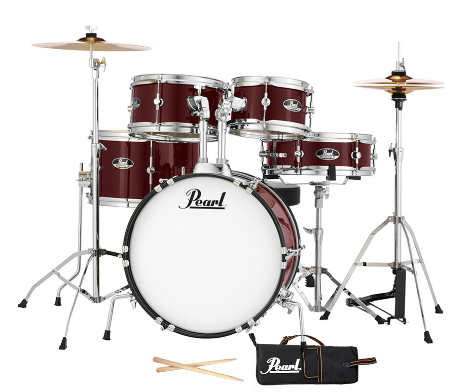 Pearl Roadshow Jr. 5-piece Drumkit with hardware, cymbals, drum throne, sticks and stick bag.