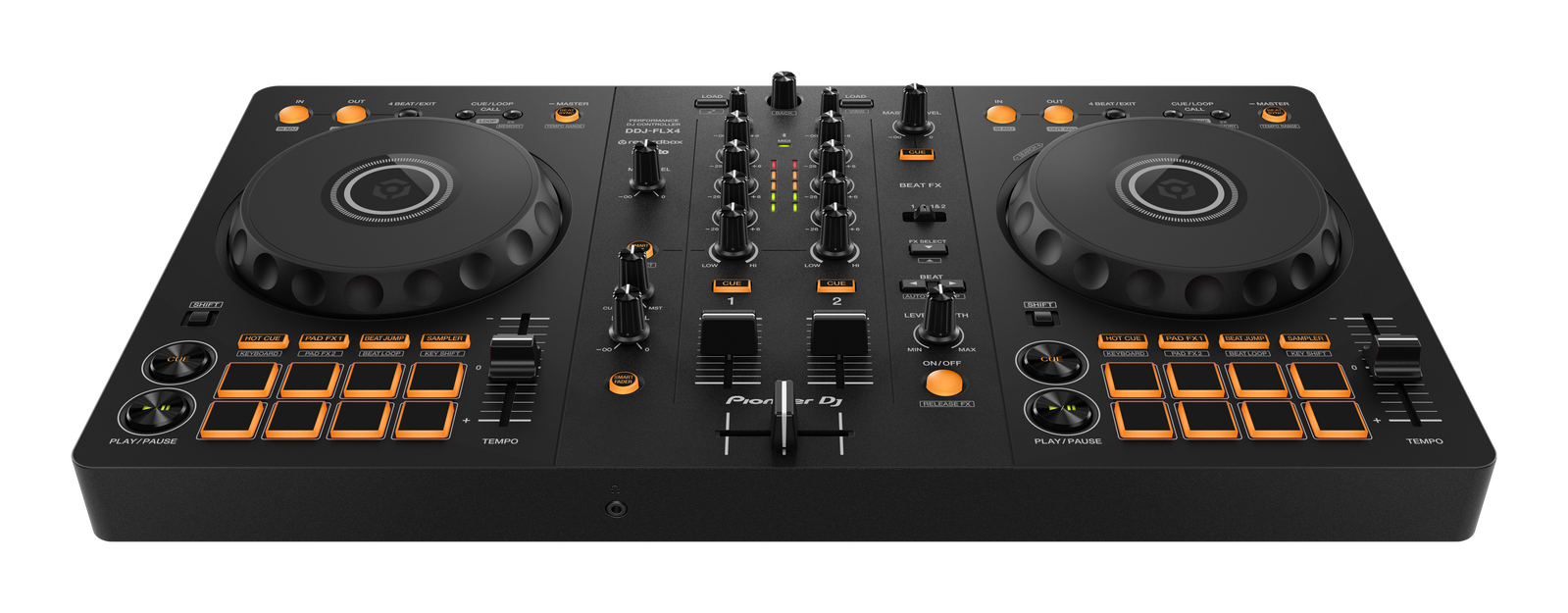 The layout of the controls on the DDJ-FLX4 makes it easy to learn to DJ and is inherited from professional Pioneer DJ products. Everything is simple to use and neatly arranged, which also makes the controller compact enough to take anywhere you want to practice or perform.
