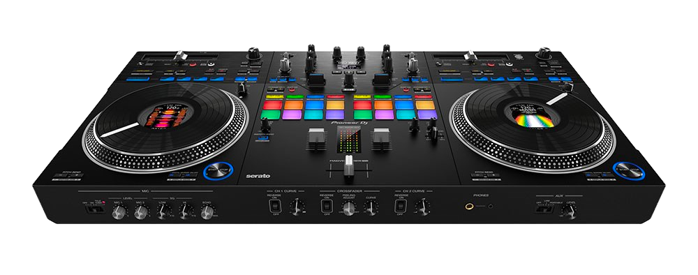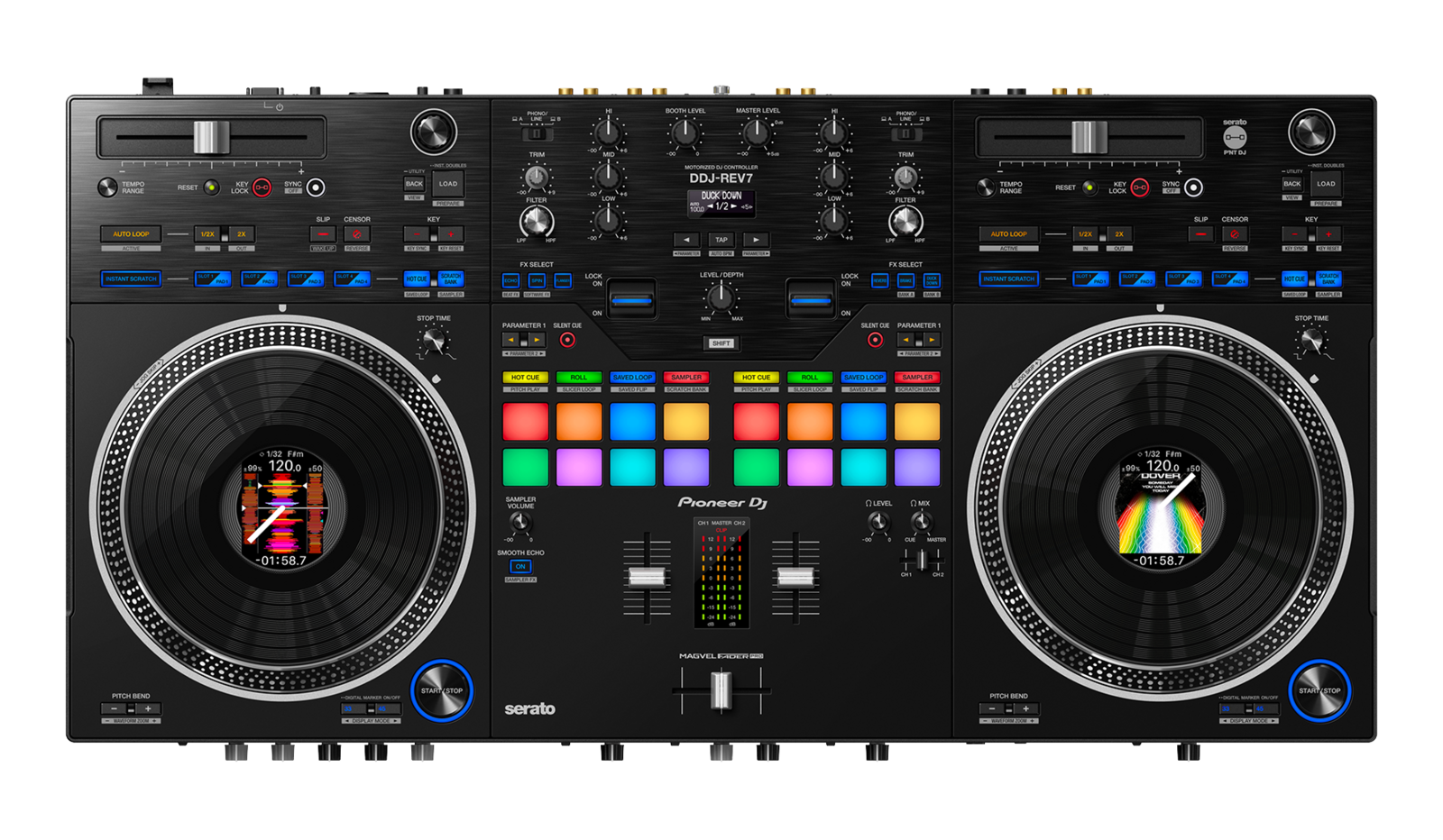 The DDJ-REV7 is built to help you get the most from the Serato DJ Pro performance software and boasts a brand-new design that includes large, motorized jog wheels with On Jog Display to create a tactile connection between you and your music. The layout of this 2-channel unit emulates a professional DJM-S mixer + PLX turntable setup, and includes specialized features for open-format and scratch DJs.