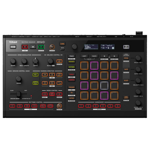 Unlock limitless creativity with the SQUID™ multitrack sequencer. Part of the TORAIZ™ series of musical instruments and production equipment, this inspiration tool will be the heartbeat of your studio and live setups. The SQUID will control your workflow and give you the chance to develop new styles of music as you create unique sequence patterns and phrases at the touch of a button. Connect, sync and simultaneously control up to 16 instruments via its multiple input/outputs. The terminals are compatible with various equipment, from your DAW and hardware instruments to modular synths, vintage synthesizers and drum machines. Perfect for on-the-fly music production, the layout and controls are effortless to navigate so your ideas will come to life the moment inspiration strikes. This production tool enables you to randomize sounds, sequences, and drums – all in key. Access endless polyrhythmic-looping options and instantly change the playback direction and speeds. With the world-first* Groove Bend feature, you’ll really feel the groove as you generate original rhythms in real time. And by controlling everything in one place, you can focus on developing phrases.