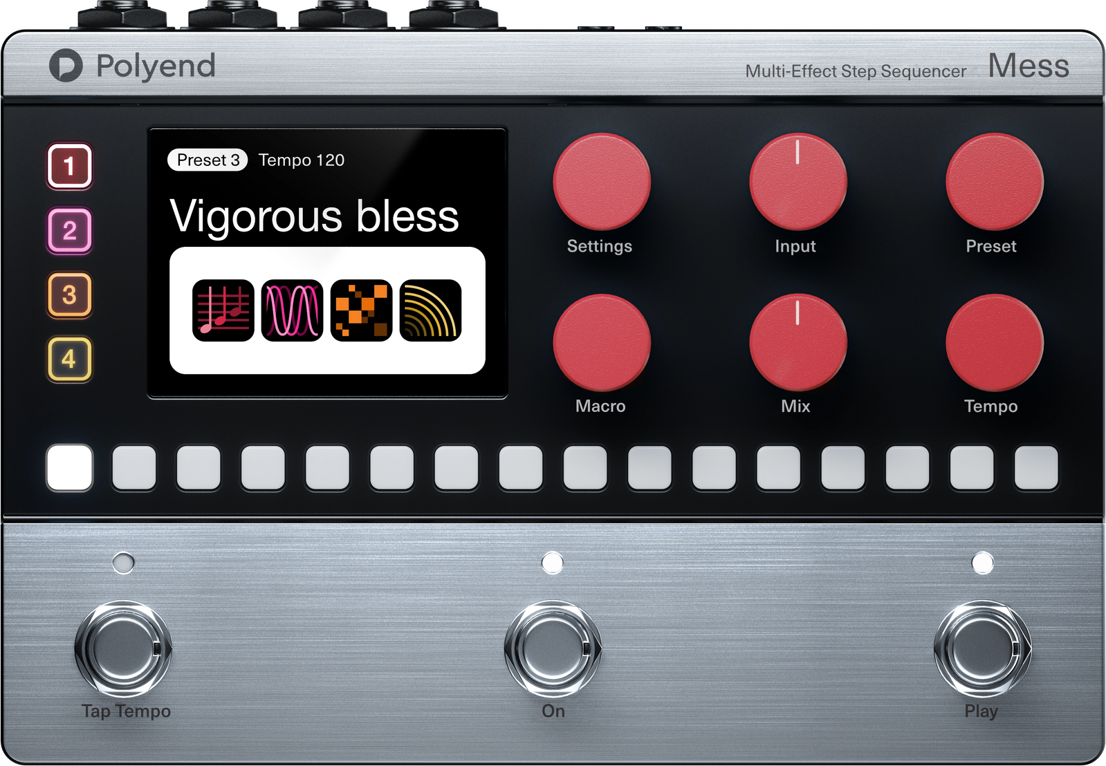 MESS combines a powerful multi-track step sequencer with effects brimming with Polyend character – from classic modulation, delay or reverb to experimental effects never before seen in pedal form. With four fully customizable effect tracks, craft ambient soundcapes, intricate glitch sequences or even a familiar four effect chain – all moving in sync.
