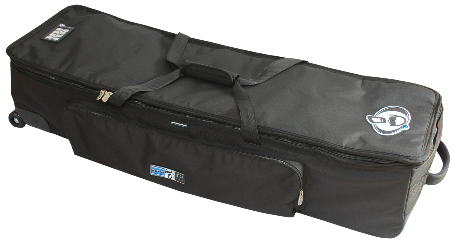 The Protection Racket 47" x 14" x 10" hardware bag wheels will comfortably house a full 5 piece kits worth of hardware. Comes with high quality replaceable polyurethane skateboard wheels.