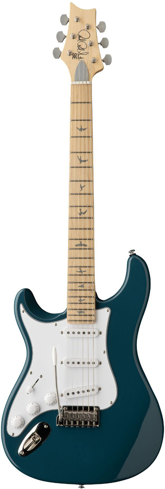 The PRS SE Silver Sky Maple starts with a poplar body, bolt-on maple neck, and maple fretboard with PRS trademark bird inlays. The 22-fret, 25.5” scale length neck features the original 635JM carve and an 8.5” fretboard radius, so the PRS SE Silver Sky will feel right at home. Plug it in, and the three single-coil 635JM “S” pickups will bark and sing. This guitar is anchored by a two-point steel tremolo, synthetic bone nut, and vintage-style tuners. Other design features include the PRS Silver Sky inverted headstock shape and the PRS double-acting truss rod (accessible from the front of the headstock for ease of use). Ships with PRS Classic 10-46 strings and gig bag.