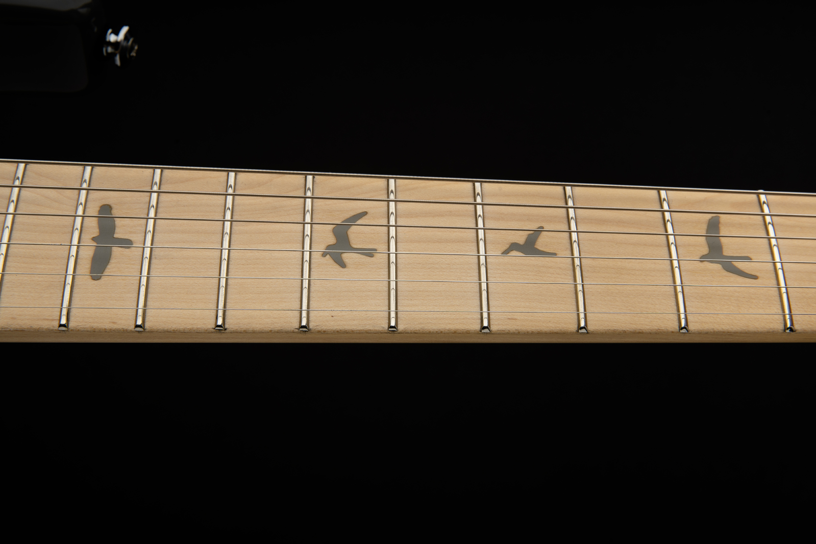 Some of the more distinctive specifications include, the headstock shape, tuners, bridge, pickups, and neck and fretboard options. The headstock shape is based on PRS’s trademark design, but inverted both to accommodate Mayer’s playing style and also to keep a consistent length of string behind the nut, which makes staying in tune easier. The tuners are a traditional vintage-style, closed-back tuner, but with PRS’s locking design. The steel tremolo takes the patented PRS design and incorporates Gen III knife-edge screws. Setup flush to the body in the neutral position so that the tremolo bridge only goes down in pitch, the bridge’s increased contact with the body allows the guitar itself to be acoustically louder, which in turn improves the signal to noise ratio of the single-coil pickups. The 635JM single-coil pickups are very round and full, with a musical high end that is never “ice-picky” or brash.