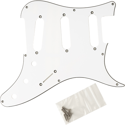 PRS Silver Sky pickguard cut for three single-coil pickups, three controls, and a 5-way switch. Conductive foil shielding on the backside to eliminate noise.0.090” (2.29 mm) thick. Eight mounting holes with additional holes for pickups and switch. Only available in White.