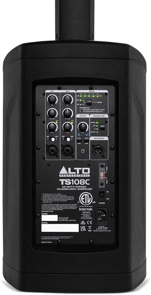 Whether a user is performing a solo set in a small café, leading a high-energy spin class at the gym, or DJing a wedding reception of 200 guests, the TS108C makes setup and on-the-fly sound adjustments effortless with intuitive, hands-on mixer controls. Users can also choose to dial in or further modify their sound via Bluetooth using the included Alto Pro app for a convenient, uninterrupted flow.