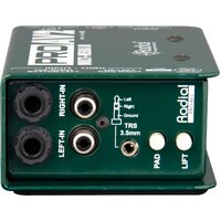 The ProAV2 is an indispensable device for live sound engineers and audio-video technicians alike, with the ability to seamlessly interface nearly any device with a pro audio system. A 3.5mm stereo input jack and dual 1/4" and RCA connectors ensure that you won't ever be hunting around for adaptor cables, while ultra-quiet performance with transformer isolation helps eliminate hum and buzz from ground loops. The ProAV2 maintains stereo separation and exhibits linear frequency response from 20Hz to 20kHz, with balanced mic-level XLR outputs that allow you to send signals through a multichannel audio snake on stage or into two channels of a mixing console.