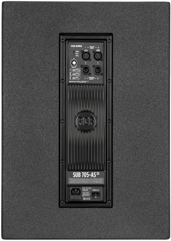 RCF's improvements in transducer design make them stronger and more powerful so the amplifier follows the evolution. With 1400W peak power, the Class-D amplifier manages extreme sound pressure levels with an ultra-fast attack, realistic transient response, and very low heat loss. The speaker design is energy-efficient so there's no need for a cooling fan. The amplifier is attached to a solid aluminum heat exchanger in the rear of the cabinet with no moving parts. The stereo input circuit with crossover features a new low distortion design with an advanced safety limiter, maintaining the true character of the input signal at all levels. RCF amplifiers are designed according to EN62368-1 for maximum safety and present a Switch Mode Power Supply section joining high-efficiency with minimum weight.