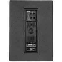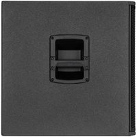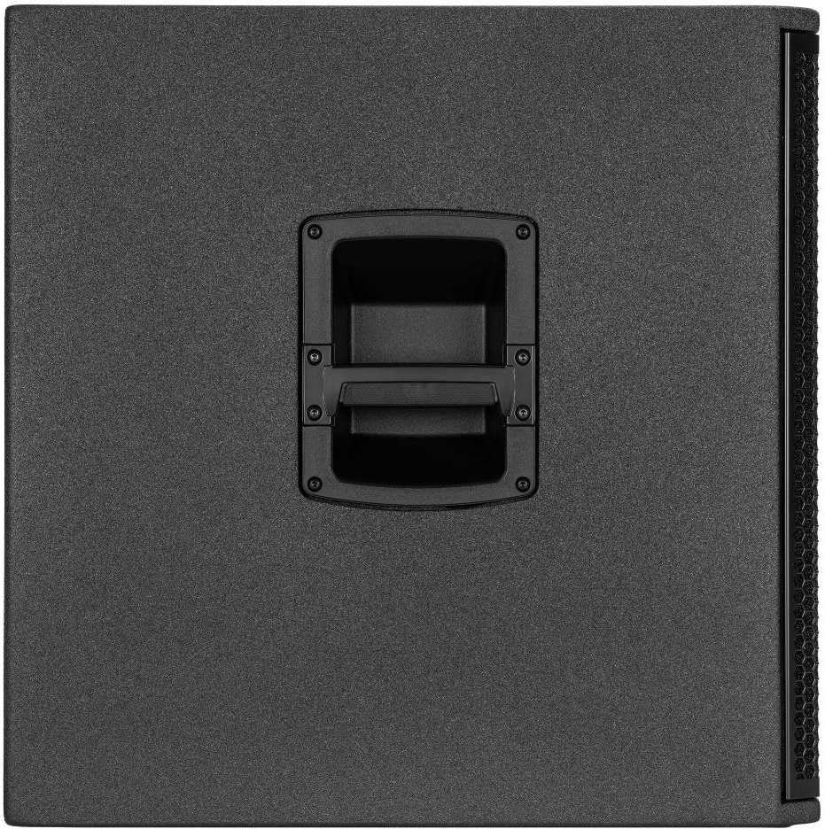 The subwoofer is suitable for a wide range of live sound applications. The rugged all-plywood cabinet is easy to carry and stack, due to its light-weight. All are equipped with ergonomic handles with rubber grips for easy set-up and tear down. The M20 threaded pole mount on the top allows the cabinet to support speakers with a pole mount. The heavy-duty polyurea coating, the powder-coated metal grille, and the rugged structure of the cabinet withstand long-term use and transportation. Separate housing for the amplifier guarantees component efficiency and reliability. An acoustically transparent sound foam backing on the inside of the grille ensures protection from dust and humidity. With its frontal vented ports, the subwoofer can also be used in recessed spaces.