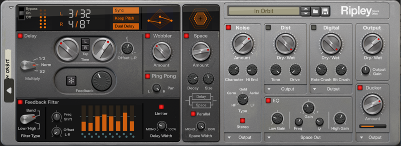 Ripley combines delay and reverb with unique flavors of filtering, noise, and distortion. Coupled with extensive modulation you can create the delay you want—anything from clean taps or warm analog sounds to crazy lo-fi chirps or washed out ambiences. Everything that adds character and depth to your music.
