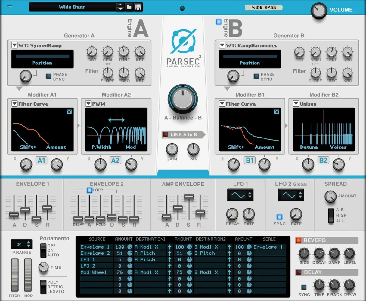 Parsec uses additive synthesis to generate sounds. The big difference, compared to subtractive synthesis, is that overtones are added to a basic sine wave signal to form complex signals. The sonic results of additive synthesis can vary dramatically; from standard “analog” type of sounds to extremely rich, complex and animated timbres. Parsec won’t leave you wishing when it comes to sonic horsepower.