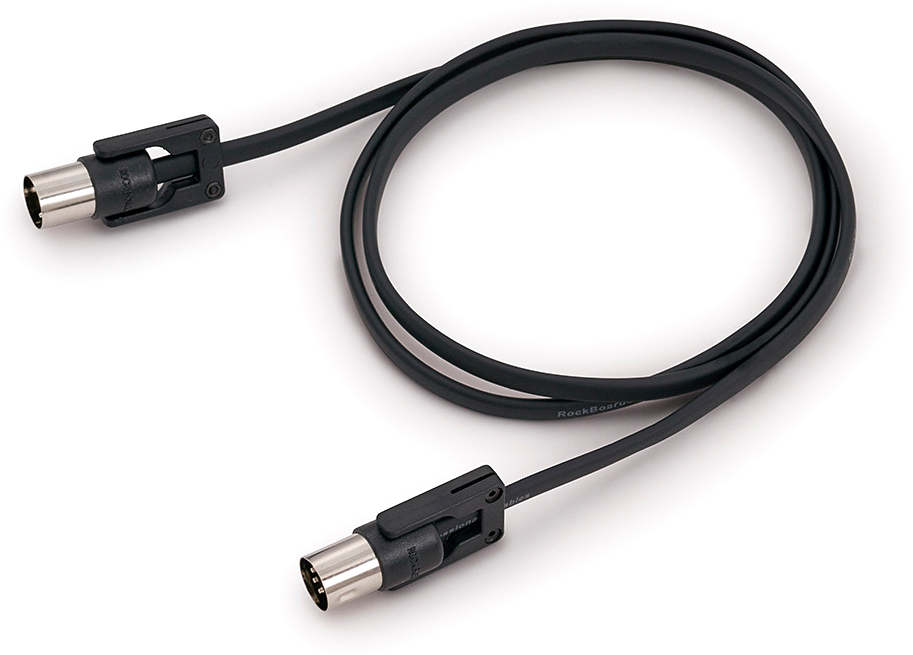 The RockBoard® FlaX Plug MIDI Cables, with their compact omni-directional design, allowing maximum freedom in adjusting the plug orientation are a logical follow-up on the RockBoard® Flat MIDI Cable design. Almost any angle is easily adjustable, with the plug securely fixed in place by two screws, regardless of the direction of the plugs: straight, angled and everything in between. This makes it very easy to adapt to various types of equipment. The flat, rectangular conductor cable effectively reduces twisting and prevents damage to the cable core. The 5-pin pinout makes the realization of almost any MIDI application possible