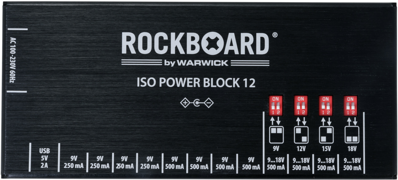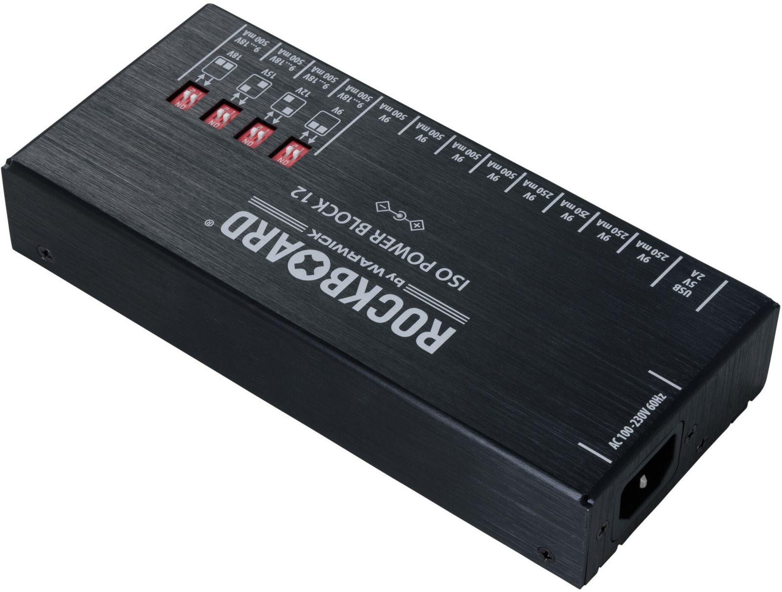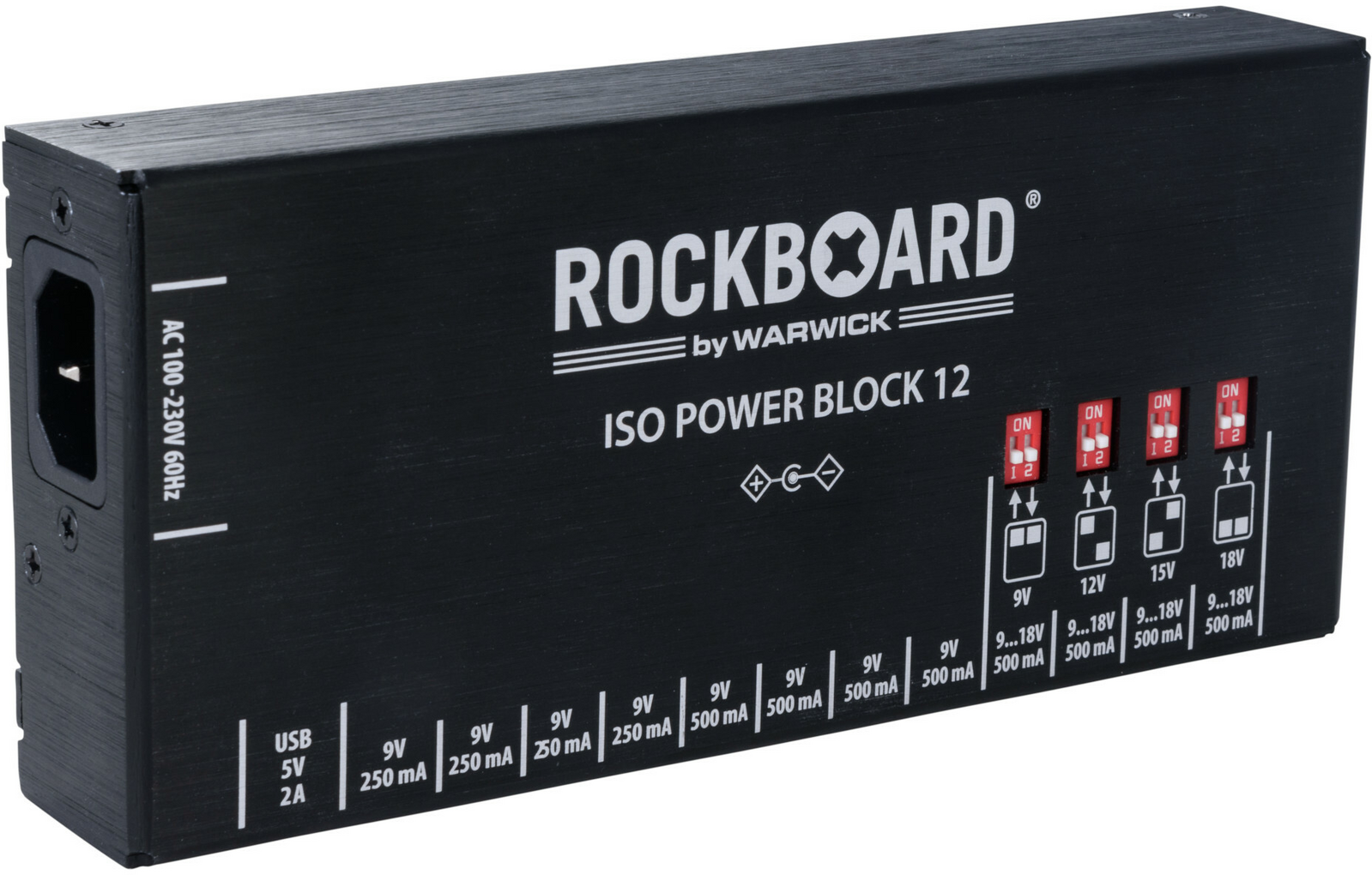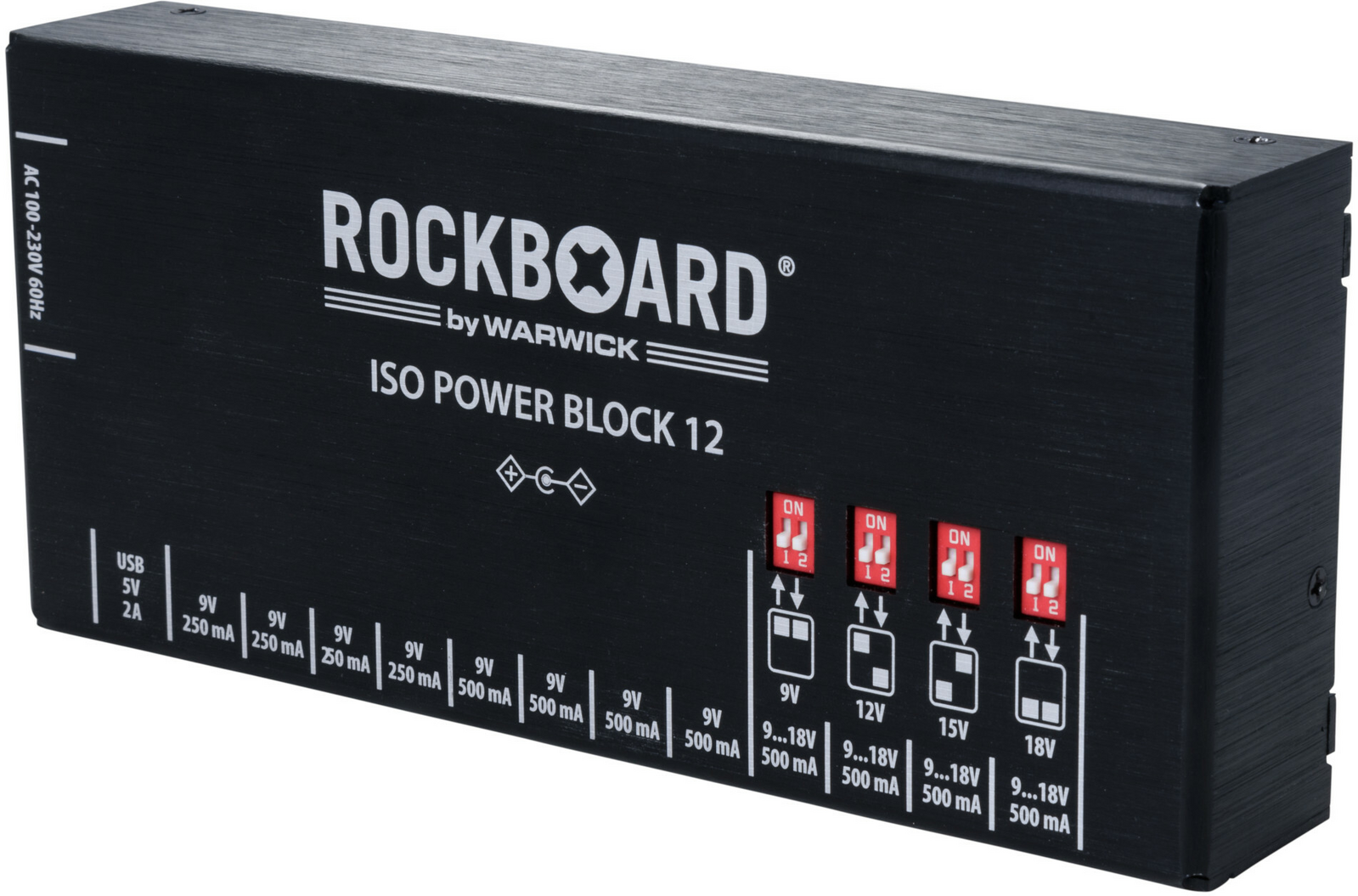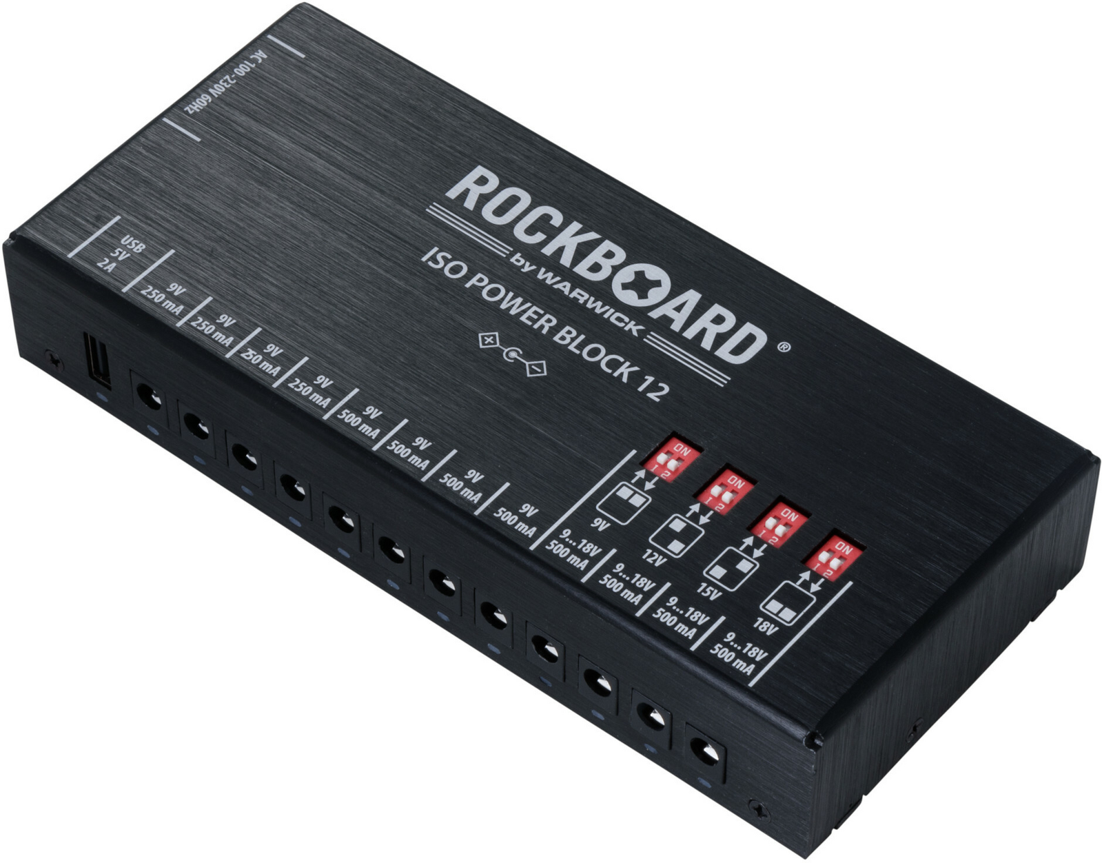 The ISO Power Blocks 6, 9 and 12 IEC are multi-power supplies for effect pedals and provide up to 12 electrically isolated, highly filtered power connections and a 5V USB connection. The multi-power supply is designed to provide noiseless power to up to 12 effects pedals simultaneously, even with different operating voltages.
