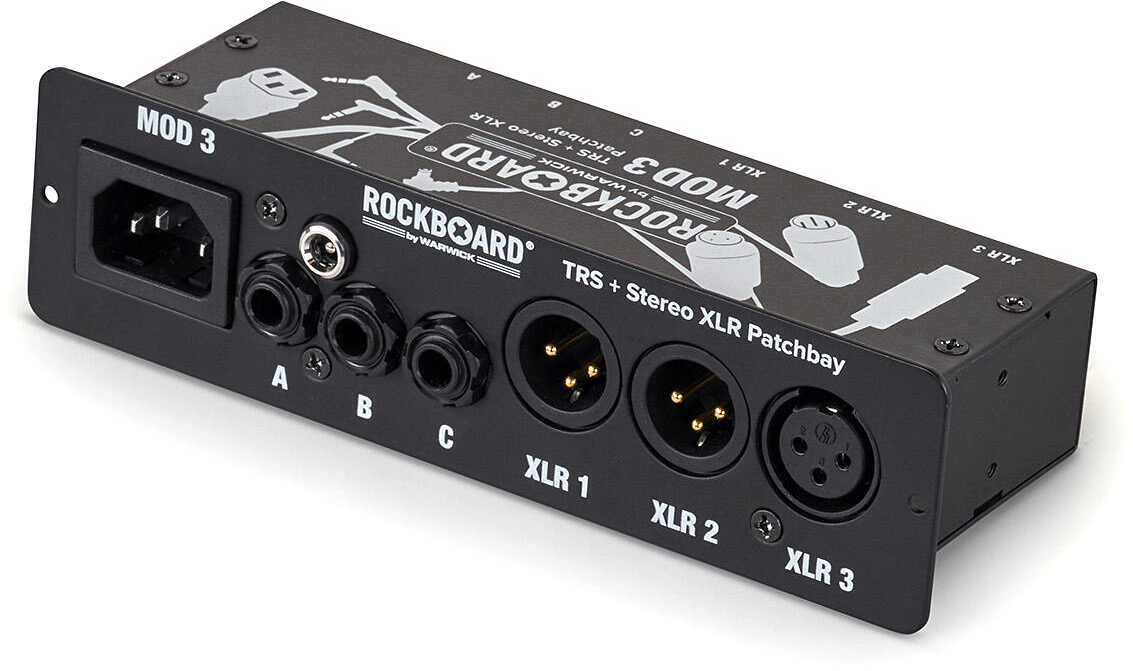 The improved RockBoard® MODs V2 are simple all-in-one patchbays for RockBoard pedalboards with a new, refreshed design, and compact housing. Utilizing the MOD slot on all new RockBoards® (except the DUO series), they provide various cable connections to fit a wide variety of needs as a convenient patchbay. With the RockBoard® MODs you can permanently connect your pedals underneath your board and organize all connections to and from your effects setup in one convenient module. The RockBoard® MODs provide a central access point from your instrument to your amp, as well as your power supply via IEC, and a 2.1 x 5.5 barrel thru power connector. The RockBoard® MOD 3 V2 is a pass-thru box designed for use by vocalists and acoustic players. The 2x XLR outputs allow you to send a stereo signal from your MOD and the 1x XLR input can be used to connect your microphone. You can also use it to run several pedals from your board through the effects loop of your amp, or simply use the MOD as a central access point to your pedalboard.