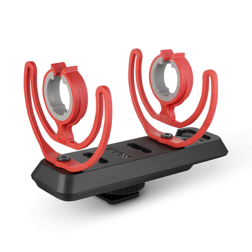 The RØDE SM3-R is a suspension shock mount for mounting RØDE shotgun and small-diaphragm studio microphones onto a camera. The SM3-R is equipped with dual Rycote® Lyre® mounts to ensure maximum isolation from any handling vibrations, four possible mounting points to suit the complete range of compatible RØDE shotgun microphones, and integrated cable management clip.