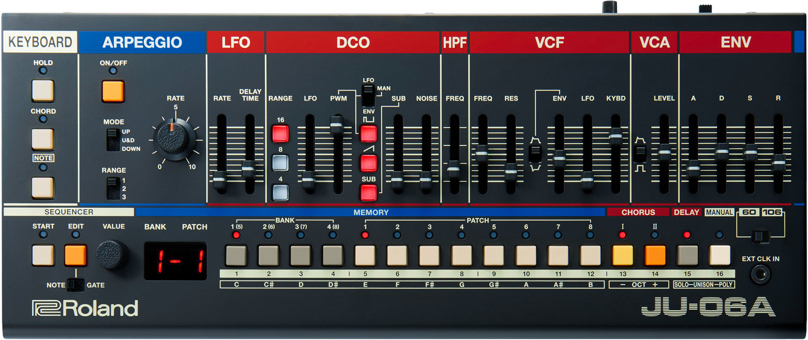 While you may prefer the filter of the JUNO-106, you might miss the arpeggio function on the JUNO-60. The JU-06A has both—and throws in chord memory and an onboard sequencer to boot. Creating sequenced lines with chord memory results in polyphonic phrases so thick they have no business coming from something that fits in your backpack.