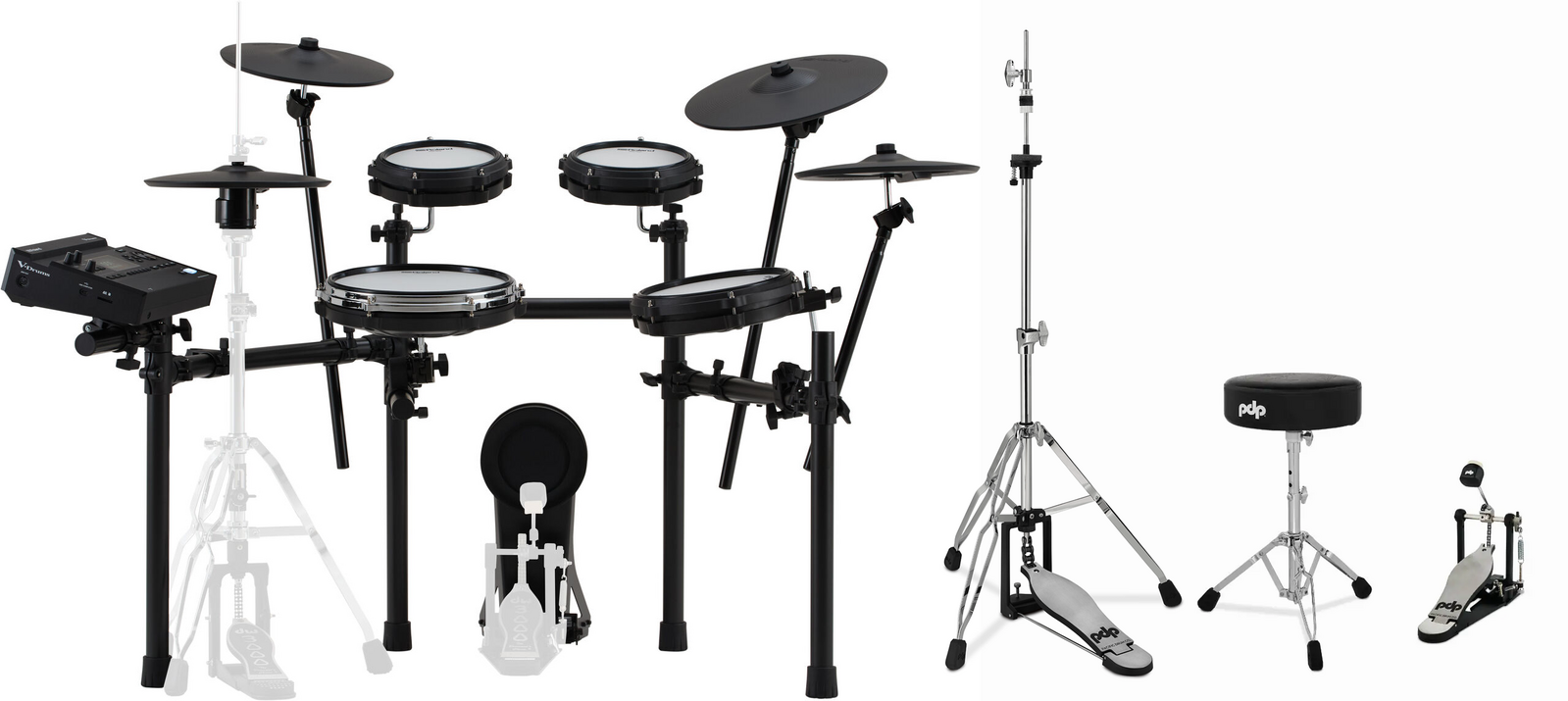 This special one click bundle contains everything you need to get started, including a hi-hat stand, a drum throne and a kick pedal! Please note: This bundle does not include drum sticks or headphones.