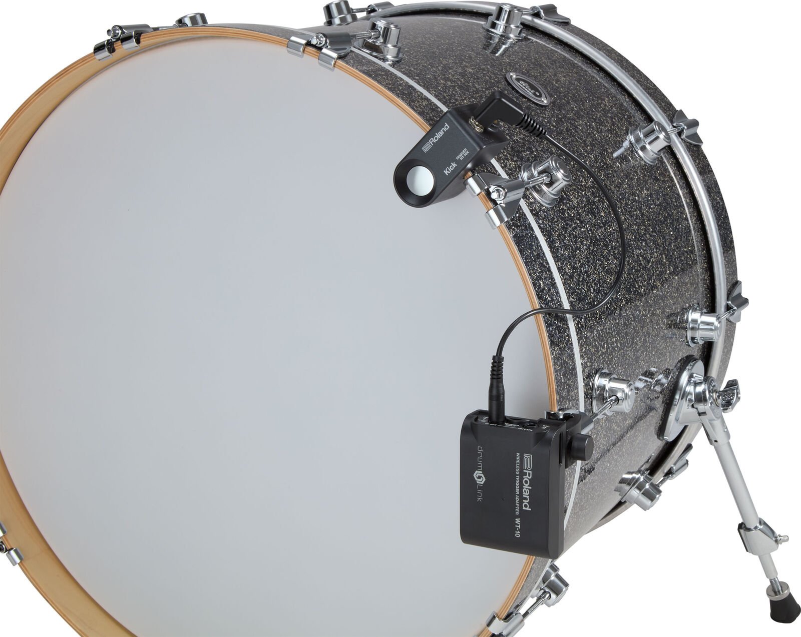 Communicates wirelessly with the Roland DH-10 DrumLink Hub or DWe DrumLink Wireless Hub