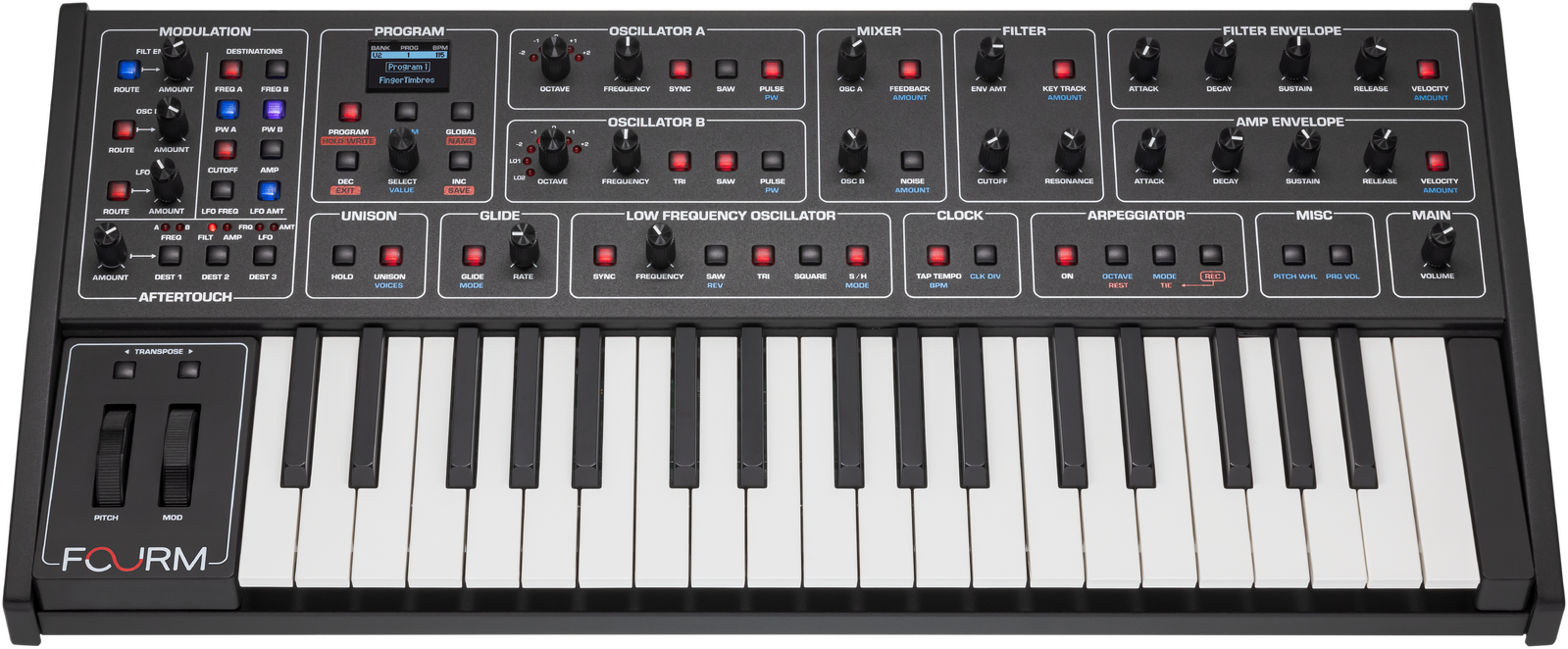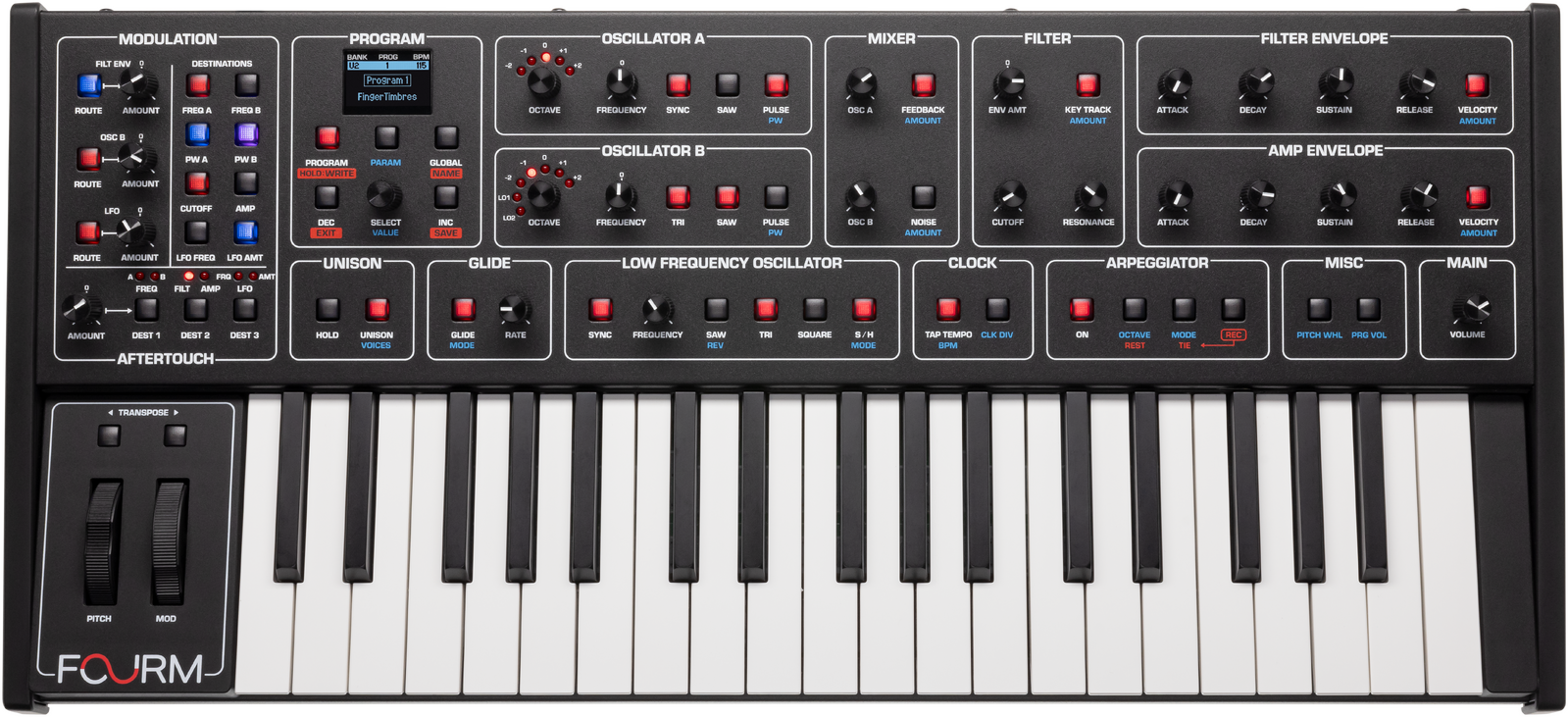 Fourm’s 37-note slim-key keyboard features polyphonic aftertouch, unlocking expressive techniques like guitar-style note bends, solo voice swells, and other nuanced articulations—completely transforming the experience of playing a modern analog polysynth.