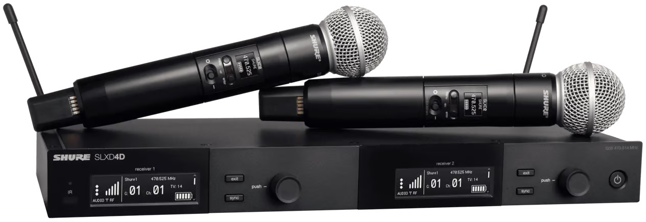 Featuring two legendary SM58® Cardioid Dynamic Microphone capsules on SLXD2 handheld wireless transmitters, the SLXD24D/SM58 provides transparent digital audio and rock-solid RF stability for lecture halls and live performances.