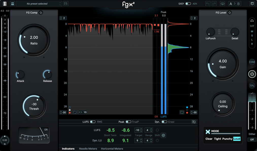 FG-X 2 comes with two presentation and processing views: Easy, the default setting for a fast & loud result, and Advanced, which unleashes an extra set of parameters for more advanced users. Whether you’re a beginner or a seasoned studio veteran, FG-X 2 has everything you need to get the job done—and then some.