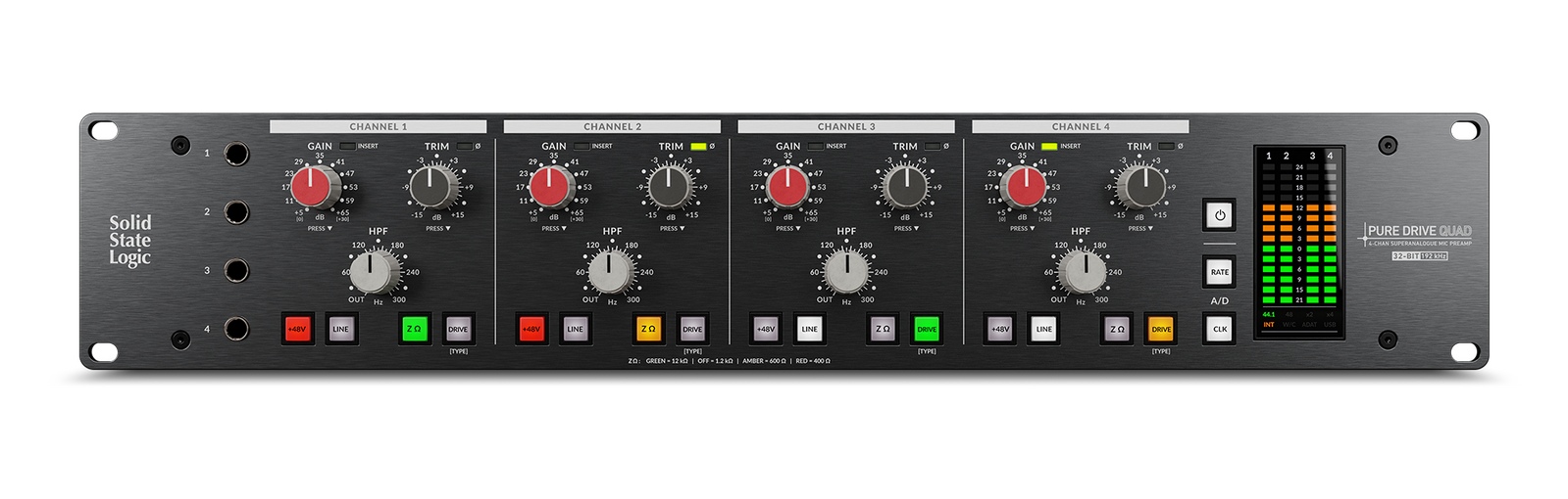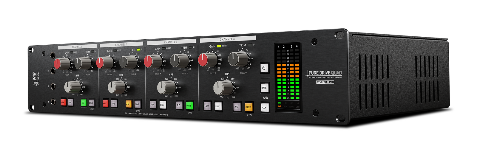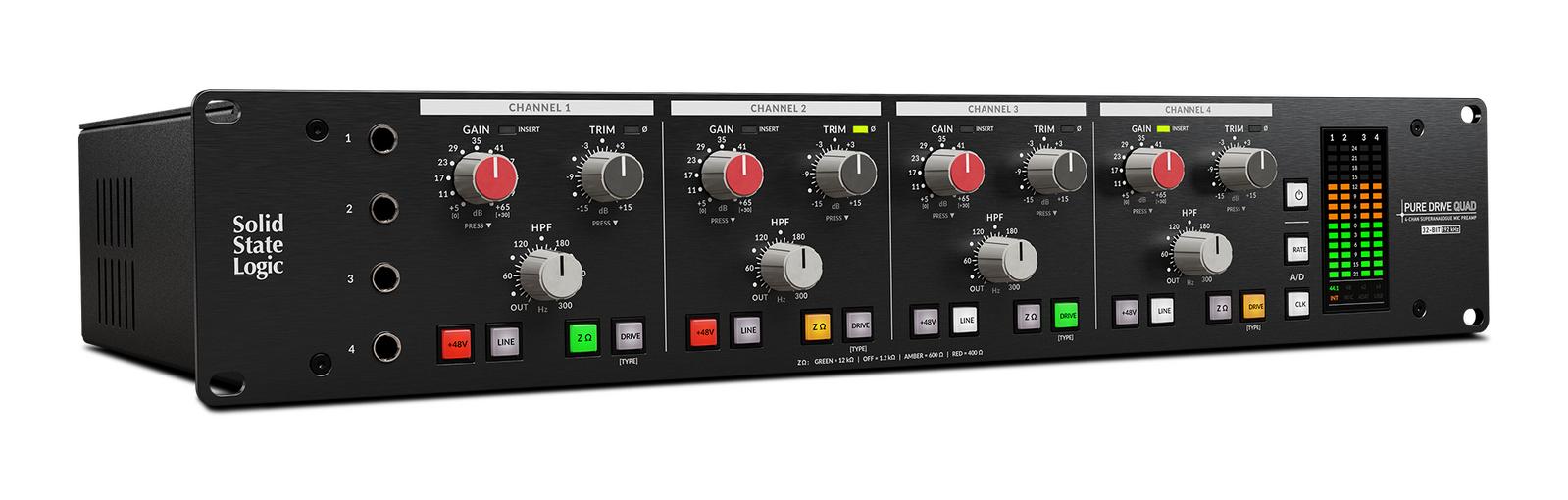 The PURE DRIVE QUAD harnesses Solid State Logic's renowned SuperAnalogue PureDrive™ microphone preamp technology, originally featured in the ORIGIN console. This advanced unit introduces a new DRIVE mode, comprehensive connectivity, and state-of-the-art digital conversion, all within a compact 4-channel 2U rackmount format. The ORIGIN recording console, a contemporary-classic from SSL, first introduced the groundbreaking PureDrive™ microphone preamplifier. This innovative preamp maintains the clarity and punch of SSL's previous designs while also offering the flexibility to switch its character to a warm, harmonically rich, and driven tone that varies with gain.