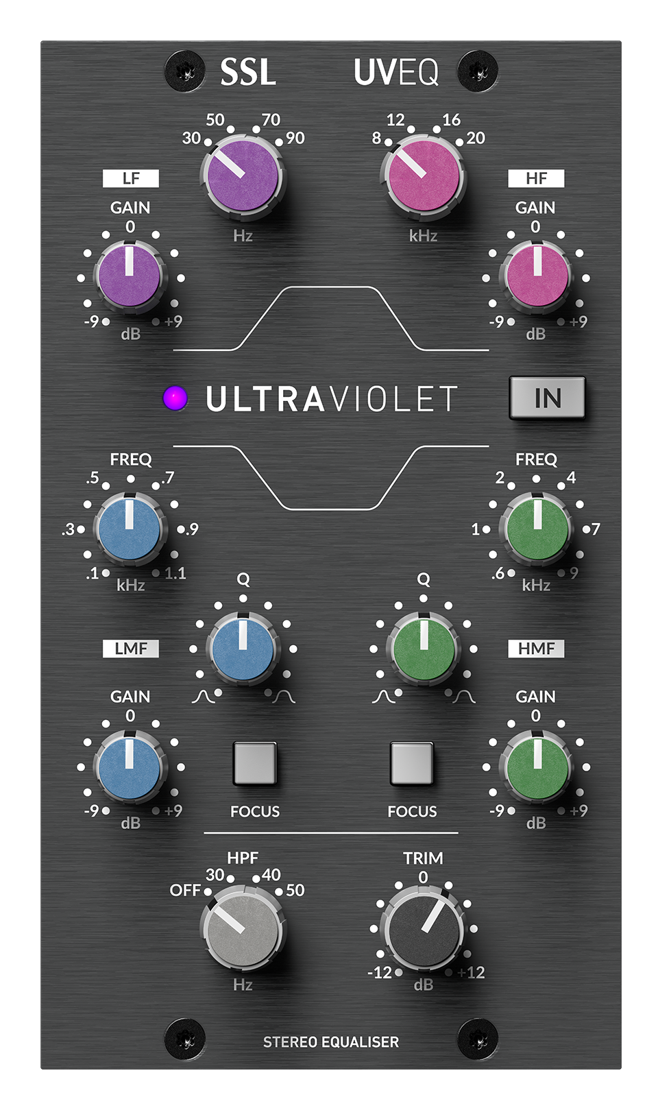 ULTRAVIOLET Stereo Equaliser (UV EQ) takes the acclaimed minimum phase-shift Violet stereo EQ section from Fusion and puts it into 500-series format, whilst adding two fully parametric SSL mid-band EQ's featuring precision 'Focus' mode for the ultimate in 500 Series EQ flexibility and tonal control. UV EQ is the perfect partner for the SSL G-COMP Stereo Bus Compressor module, offering advanced SSL processing all from 500 Series modules.