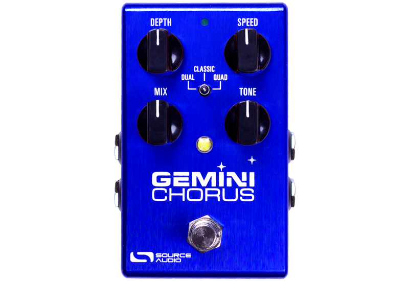 The Gemini Chorus offers three types of deep, hypnotic chorus. Classic mode creates a single voiced effect that conjures subtle and creamy tones from the first wave of 1970s chorus pedals. The thick and rich Dual Chorus provides a smooth, yet animated double voiced effect. The lush and spacious Quad chorus recaptures that ‘80s vibe with its less than subtle rack system sound.
