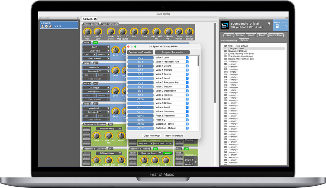 The Source Audio MIDI Adapter provides full MIDI functionality to all single-footswitch One Series pedals including the C4 Synth, Aftershock Bass Distortion, Atlas Compressor, and Spectrum Intelligent Filter. The MIDI Adaptor is a compact, bus-powered, intelligent adapter compatible with any standard MIDI Controller with a 5-pin MIDI DIN output. Use MIDI PC messages to switch presets, MIDI CC messages to change parameter settings or move parameters with an expression pedal, and MIDI clock messages to set LFO modulation and sequencer rates.