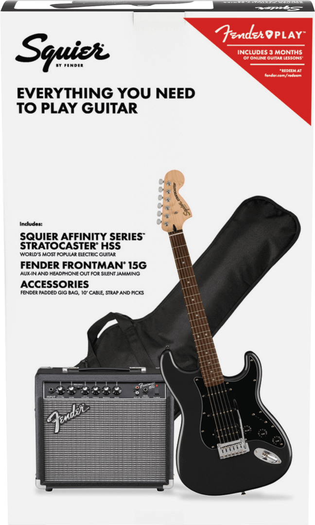 Delivering 15 watts of pure Fender tone, the Frontman 15G amplifier features both clean and overdrive channels, three-band EQ, headphone jack for silent practice and an aux input for connecting a media device. With the included padded gig bag, picks, strap and 10' cable, the Squier Affinity Stratocaster HSS Pack has everything you need to turn your affinity for music into a lifelong passion.