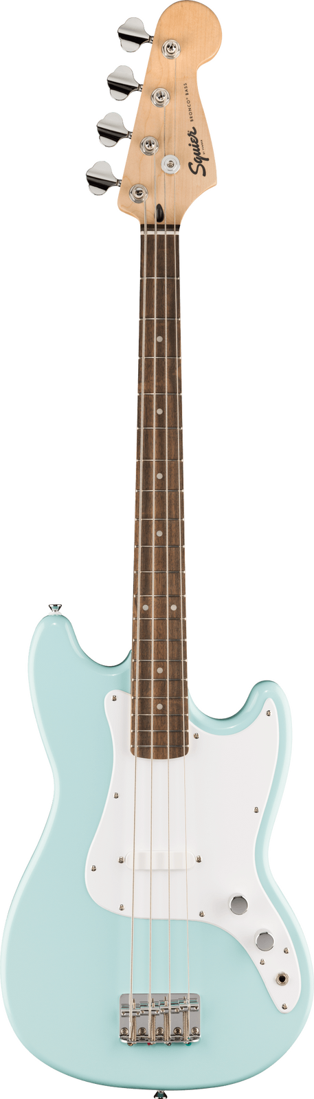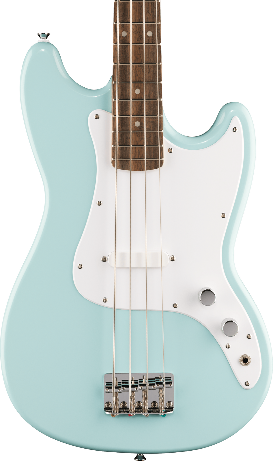 The Squier Sonic® Bronco® Bass is ready to launch any musical adventure into warp speed, offering iconic Fender® style and inspiring tone for players at any stage. This Bronco Bass sports a slim and inviting "C"-shaped neck profile with a narrow 1.5" nut width and a thin, lightweight body for optimal playing comfort while a Squier® single-coil pickup delivers punchy bass tone. Further details of this model include a short 30" scale length, 4-saddle hardtail bridge for precise intonation adjustment, sealed-gear tuning machines for smooth, accurate tuning and durable chrome-plated hardware that is sure to catch the spotlight.