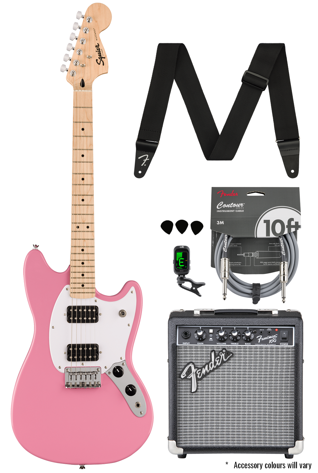 The Squier Sonic® Mustang® HH is ready to launch any musical adventure into warp speed, offering iconic Fender® style and inspiring tone for players at any stage. This Mustang sports a slim and inviting "C"-shaped neck profile and a thin, lightweight body for optimal playing comfort while a pair of Squier® humbucking pickups (HH) serve up substantial, high-output tone. Further details of this model include a short 24" scale length, 6-saddle hardtail bridge for reliable intonation, sealed-gear tuning machines for smooth, accurate tuning and durable chrome-plated hardware that is sure to catch the spotlight.