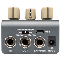 Selectable tube-modeled preamp voices. Artifact-free tap tempo. Discrete stereo operation for independent processing of the left and right stereo inputs. Straightforward controls and expression pedal capability. High-impedance, ultra-low noise discrete Class A JFET stereo input preamp for exceptional touch sensitivity, dynamics and feel. MIDI control of tempo, patch save/recall and more. Premium components, rugged construction and a USB jack for performing firmware updates or controlling the pedal from a computer.