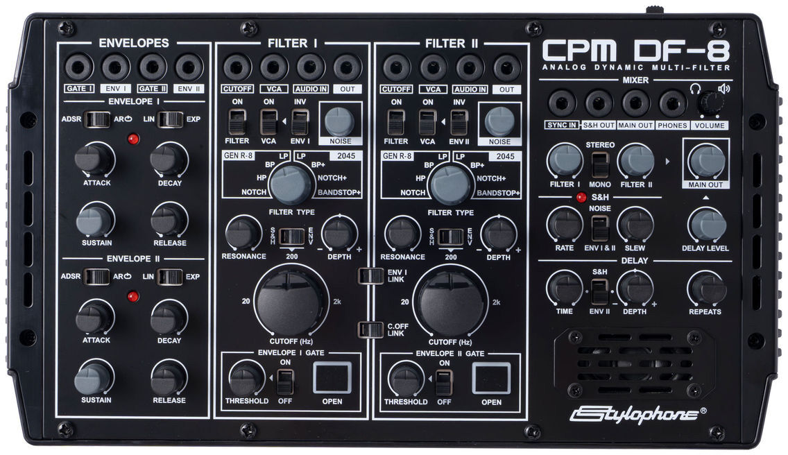 2 filter channels (2045/GEN R-8) with 8 filter types each, controlled by two full ADSR envelopes with multiple trigger modes.