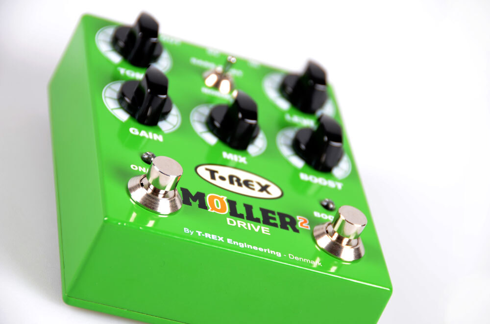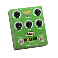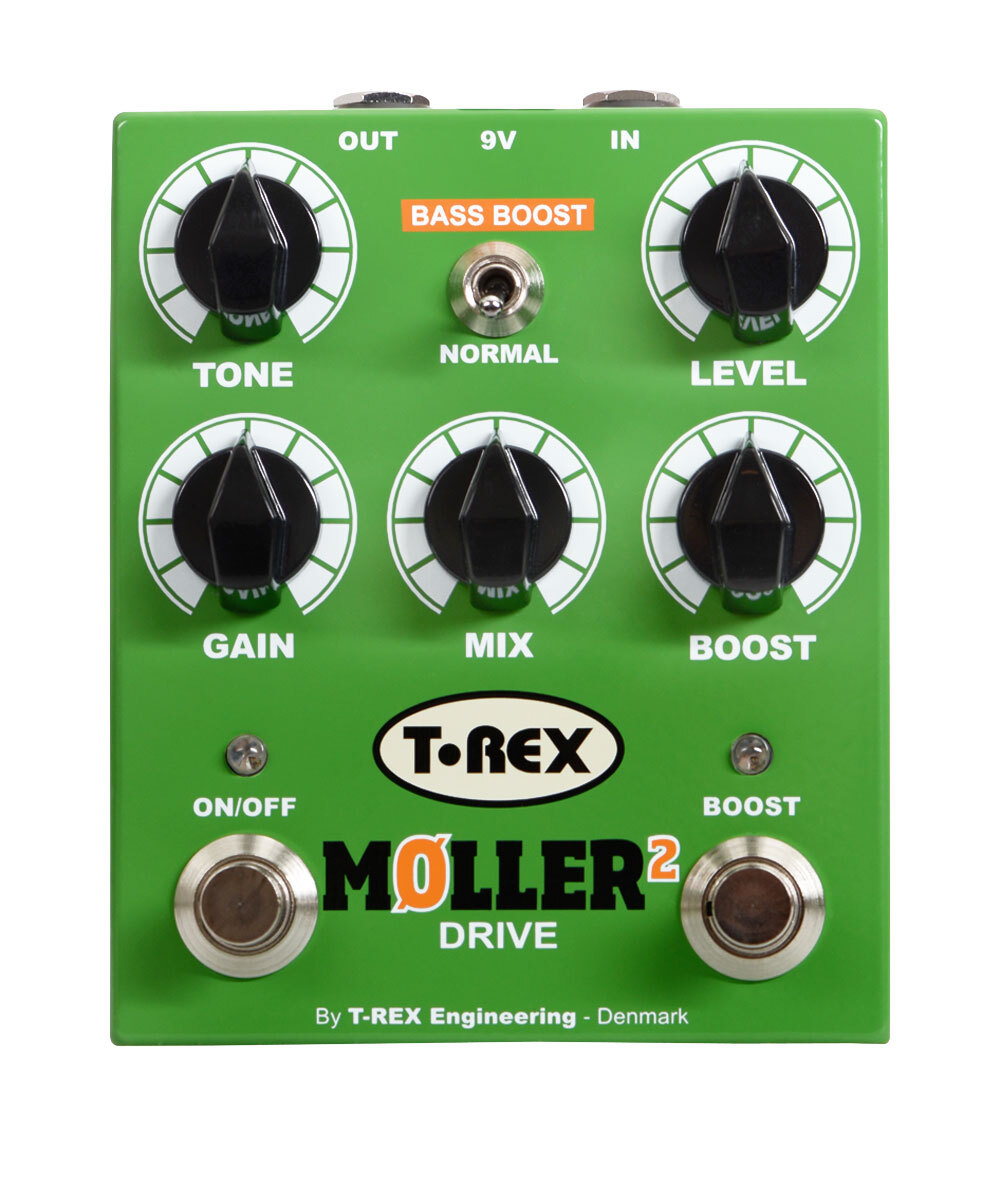 T-Rex Møller 2 delivers the same classic overdrive that made it's predecessor one of T-Rex’s most sought-after pedals. Named after Danish guitarist Knud Møller, for whom the original pedal was designed, Møller 2 features a more durable “Bass Boost” toggle switch and easier-to-read control knob graphics. The pedal is armed with a 0-20 db clean boost, as well as a mix control which lets you dial in the perfect balance between distorted and clean signals. Rolled all the way up and with distortion maxed, the pedal sounds just like a vintage tube amp at full volume. Roll the Mix knob back a bit, and your clean signal starts to get through; if you pick lightly or roll back your guitar volume, you get a stunning clean, softly-clipping sound that retains all the feel and dynamics of your original tone, only bigger, louder and richer. The boost function lets you dial in a solo level, whether the overdrive circuit is activated or not.