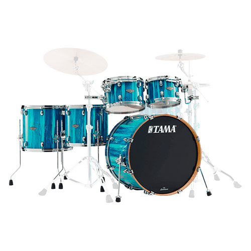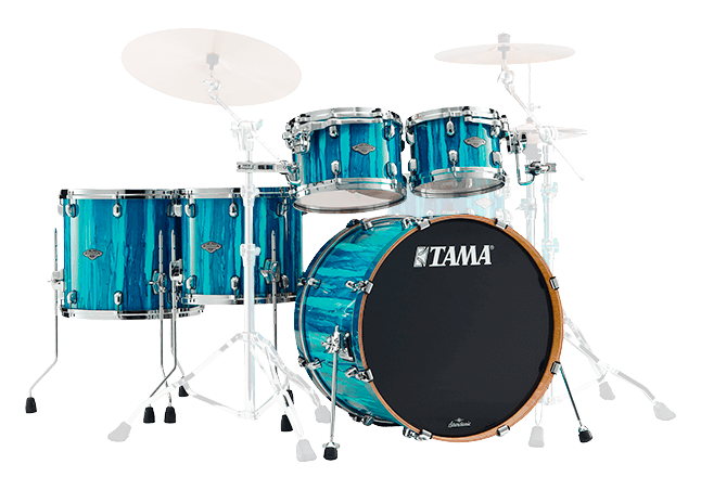 EVANSR G1 coated batter and TAMA clear single-ply Power Craft II resonant heads are equipped on the toms. Bass drums include EVANSR clear EQ4 batter heads, Tama resonant head with muffle ring. Snare drums are fitted with EVANSR G1 coated batter heads and EVANSR 300 snare-side head.