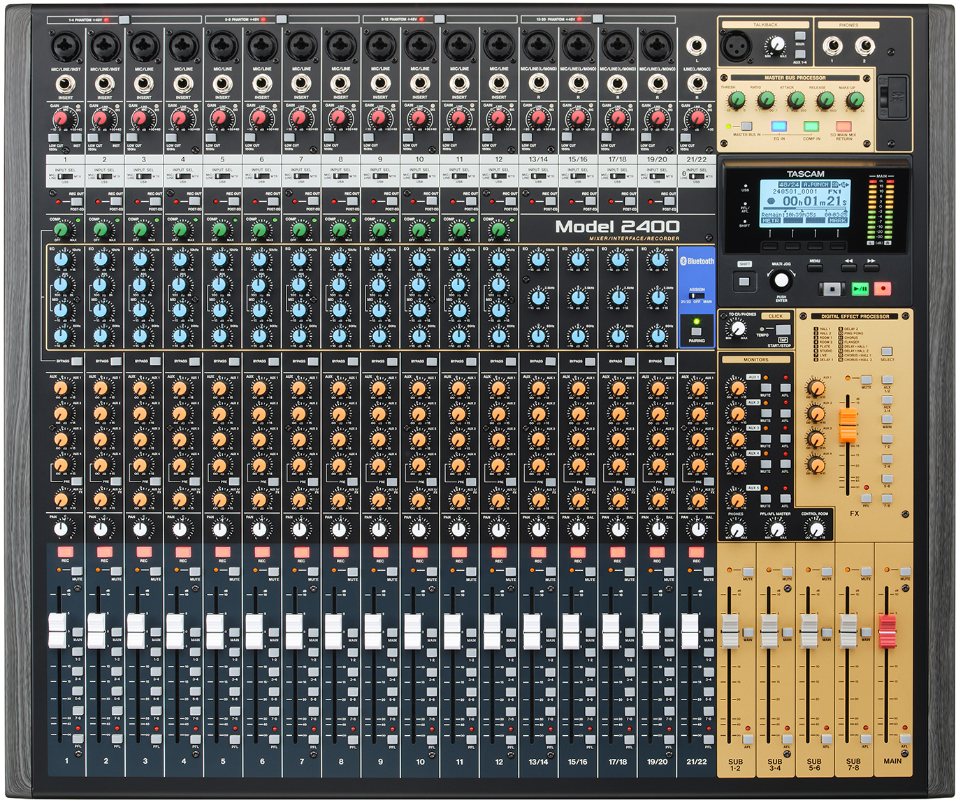 Model 2400 seamlessly integrates multitrack recording with studio and live mixing. With the ability to record 24 channels (22 inputs plus the stereo master) of high-quality audio direct to SD card media, Model 2400 is a powerful recording solution even if you’re a DAW-less producer.